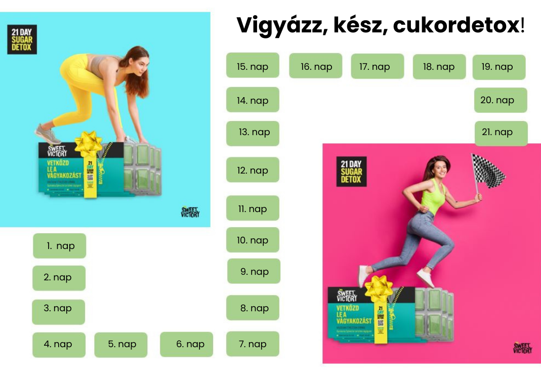 A 21 napos cukordetox program hatékony módja annak, hogy megszabaduljunk a hozzáadott cukrok iránti függőségtől, és elinduljunk egy egészségesebb életmód felé. A Sweet Victory 21 napos detox program célja, hogy napi 2-3 rágógumi fogyasztásával nemet tudj mondani a túlzott bevitelre, illetve az egészségtelen édességfogyasztási szokások leküzdésével hosszútávon egy kiegyensúlyozott, egészségesebb életmódot tudj fenntartani.